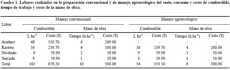 El costo de las labores realizadas, combustible consumido en L ha -1 y costo del mismo, así como el tiempo de mano de obra, son notablemente más bajos en el manejo agroecológico que en el convencional. Se contabilizó una diferencia de $519.77. El menor costo total del manejo agroecológico, es debido a la disminución de la aradura del suelo (Cuadro 1). Los resultados concuerdan con lo establecido por Collins et al. (1981), Frisby y Summers (1979), Hetz (1988), Reid (1978) y Summers et al. (1986). Dichos autores señalan que la diferencia se origina principalmente en la cantidad de suelo removido y el roce que se produce con cada uno de los implementos de labranza.