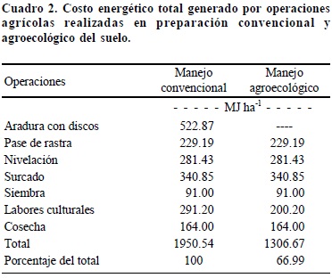 Los resultados del costo energético de la siembra se aprecian en el Cuadro 2. Los costos energéticos totales del manejo convencional fueron mayores. El manejo agroecológico ocasiona un gasto energético total de 1950.54 MJ ha-1, que corresponde a sólo 67% del costo del manejo convencional. Se ahorran 10.94 L de combustible diesel por cada ha trabajada.