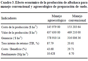 - El empleo de un manejo agroecológico en la preparación del suelo en las condiciones de aridez de Baja California Sur permitió alcanzar mejores resultados en la producción de la albahaca, de tal modo que la rentabilidad económica fue de 87.79%, y el incremento en la utilidad fue de 43.68%, por arriba de la obtenida en el manejo convencional.