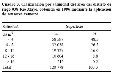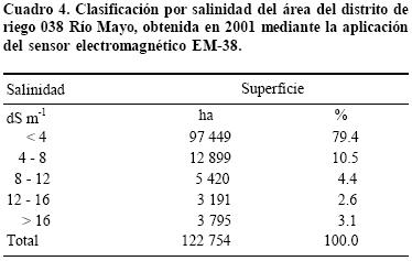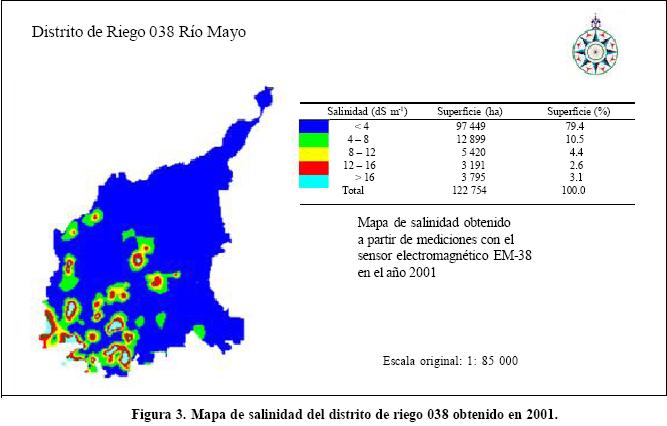 Utilizando el sensor electromagnético EM 38 y el sistema global de posicionamiento, en el año 2001, se cartografiaron 122 754 ha considerando la profundidad 060 cm, de las cuales 25 305 ha (20.6%) se clasificaron como salinas (CE > 4 dS m1). Esta superficie resultó menor que la obtenida en 1996, de 62 181 ha (51.5%), en el cual la identificación de la salinidad se realizó mediante imágenes de satélite y el sensor EM38. En ambos estudios la superficie afectada se distribuyó en los módulos de riego 1, 2, 5, 6, 8, 10 y 15, ubicados en las zonas baja y central del distrito; en estos módulos es donde los problemas de salinidad y manto freático superficial se han manifestado desde que el distrito de riego entró en operación, hace aproximadamente 40 años.