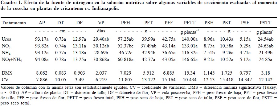 También se observó (Cuadro 1) que el crisantemo puede utilizar adecuadamente la urea (NH2-CO-NH2), ya que produjo efectos similares al nitrato (normalmente la fuente más utilizada), contrario a lo que reporta Resh (1996) y Havlin et al. (2005) quienes sugieren sólo utilizar nitrato y excluir al amonio y urea de la solución nutritiva porque pueden ser tóxicos. Al respecto, Harper (1984) menciona que existen plantas que pueden metabolizar completamente la urea como única fuente de N.
