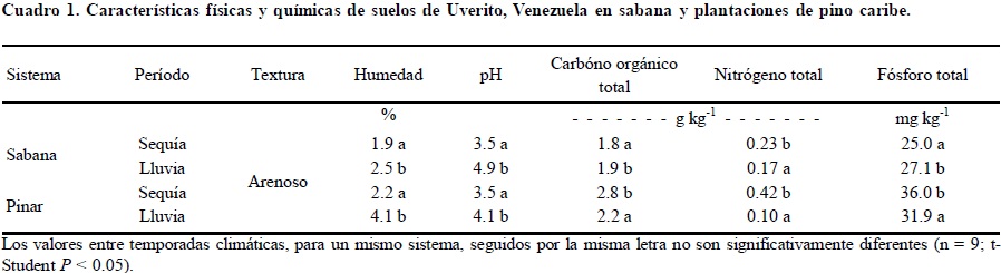 El análisis físico y químico de los suelos de Uverito refleja que éstos son arenosos en su horizonte superficial (en promedio es de 86.64%), lo cual permite un drenaje excesivo, efecto que explica el bajo contenido de humedad de los mismos (1.9% durante la época seca y 4.1 % durante la época lluviosa). Son suelos fuertemente ácidos (pH 3.5 - 4.9) que poseen una fertilidad natural muy baja, en los cuales el contenido de C orgánico total no supera los 3 g kg-1, el N total varía entre 0.1 y 0.4 g kg-1 y el contenido de P total entre 25 y 36 mg kg-1 (Cuadro 1). Estas son características que constituyen factores altamente limitantes para las poblaciones microbianas y sus actividades.
