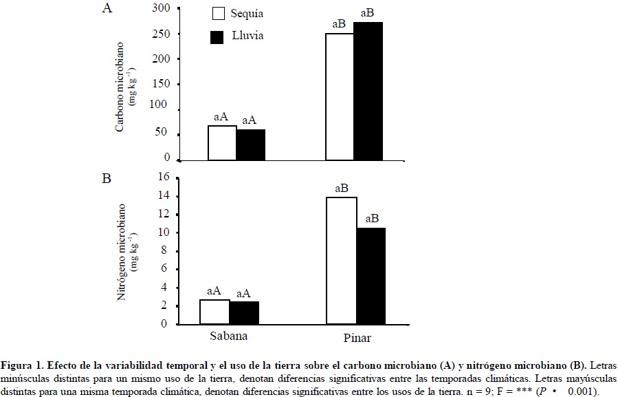 En contraste, al efecto de la sustitución del sistema de sabanas por pinares sobre la biomasa microbiana, la variación temporal no ejerció un efecto significativo sobre el Cmic y el Nmic presentes en ambos sistemas (Figura 1A y B). Estos resultados coinciden con los informes de Luizao et al. (1992) en estudios realizados para suelos de zonas tropicales.