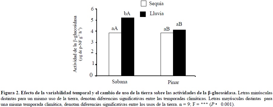 La variabilidad temporal afectó significativamente la actividad de la β-glucosidasa, la cual mostró una mayor tasa de la mineralización del C durante la temporada lluviosa, efecto asociado a las mejores condiciones de humedad, temperatura y actividad microbiana, factores que influyen sobre la actividad microbiana y controlan los procesos de descomposición de la materia orgánica (Maire et al., 1999). Las mejores condiciones de humedad favorecen el proceso de mineralización de la materia orgánica que permanece acumulada durante el período de sequía (Bottner, 1985).