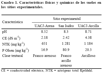 La textura de los suelos fue de franco arenoso a arcilloso (Cuadro 1), lo cual cubre la variación de suelos existente en el Valle de Juárez, ya que por su origen aluvial existe mucha variación de texturas. Los suelos de los tres sitios presentaron un pH moderadamente alcalino de 8.3 a 8.7; la conductividad eléctrica en el sitio UACJ-Arcilla estuvo en el rango de 2 a 4.4 dS m-1 clasificado como salino, mientras que los suelos de los otros sitios no mostraron problemas de salinidad, aunque conviene aclarar que otros estudios reportan que son de salinidad moderada entre 4 y 5 dS m-1 (Castellanos et al., 2000). Las concentraciones de NTK del suelo variaron de 650 mg kg-1 en la textura arenosa hasta 1 184 a 1 281 mg kg-1 en el arcilloso y franco arcilloso, mientras que la concentración de fósforo aprovechable (Olsen) presentó un rango de 17 a 81 mg kg-1, valores considerados altos a muy altos.
