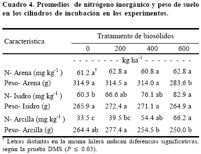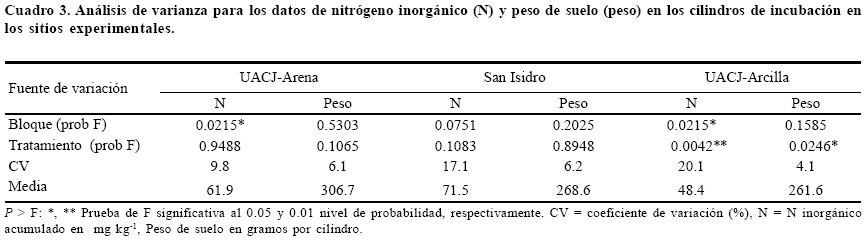En el Cuadro 3 se observa que los coeficientes de variación fueron mayores para la variable N inorgánico, lo cual resultó evidente por la variabilidad del N en el suelo que es afectado por la actividad de los microorganismos del suelo, la cual a su vez depende de factores ambientales (Flores et al., 2007; Ross, 1996). Los promedios de N inorgánico acumulado variaron de 48 a 71 mg kg-1, el sitio San Isidro presentó la mayor cantidad de N. Con respecto al peso del suelo en los cilindros, en promedio variaron de 262 a 307 g, lo cual se utilizó para convertir el N atrapado en las resinas a mg kg-1 de suelo. La variación en el peso del suelo entre cilindros puede ser atribuida a la dosis de biosólido que cambia la densidad aparente del suelo al agregar materia orgánica (Brady y Weil, 1996) y otra causa posible fue alguna ligera pérdida de suelo durante los cambios de las resinas en el campo.