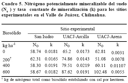 La tasa de mineralización de nitrógeno (N) fue afectada por la textura del suelo y la dosis de biosólidos. Los patrones de mineralización de N variaron conforme la texturas de suelo. La dosis de biosólido de 600 kg ha-1 produjo la más alta mineralización de N en los suelos de arcilla y franco, pero en el sitio de arena no se encontró diferencia significativa. Las tasas constantes (k) variaron entre 0.0031 y 0.0219 mg por día,los valores del N potencialmente mineralizable (No) estuvieron entre 51.08 y 102.48 mg kg-1 suelo. La mineralización neta del N en promedio fue 0.145 a 0.47 mg N-NH4 + NO3 kg-1 por díapara los sitios evaluados. El suelo franco presentó la mayor tasa de mineralización de N con 83 mg kg-1, seguido del suelo arcilloso con 66 mg kg-1 suelo. El porcentaje de N mineralizado con el método de las resinas sintéticas estuvo entre 3 y 7% para las dosis evaluadas en los sitios San Isidro y UACJ-Arcilla. La mineralización estimada con el método de la diferencia con base en el análisis de N total Kjeldahl (NTK) del suelo fue de 28% para los sitios San Isidro y UACJ-Arcilla, mientras en el sitio UACJ-Arena no se detectó diferencia significativa. Las ventajas del método de las resinas en cuanto a la medición más controlada de la mineralización de N puede justificar la utilización de una tasa de 10% de mineralización como primera aproximación para cálculos de dosis de biosólidos estabilizados con cal para su aplicación a nivel comercial.