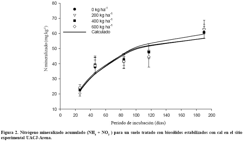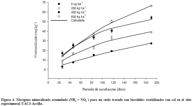 La falta de mineralización del N en el suelo arenoso puede atribuirse al hecho de que la humedad del suelo fue muy baja durante el periodo de incubación y el N retenido en las resinas se obtuvo del agua residual con la que se regó la parcela la cual contenía en promedio 15 mg L-1 de N inorgánico. El sitio UACJ-Arcilla presentó un aumento de 39 mg kg-1, es decir 88 kg ha-1 de N para la dosis de 600 kg ha-1 al sumar el N agregado en el agua de riego que fue 64 kg ha-1 da un total de 152 kg ha-1 disponibles al cultivo de alfalfa, además de la capacidad del cultivo para fijar N atmosférico por simbiosis con Rhizobium, por lo que se deduce que pudo haberse satisfecho la demanda nutrimental del cultivo en etapa temprana de desarrollo, ya que la demanda total de N es de 392 kg ha-1 (Havlin et al., 1999). La aplicación de biosólidos en dosis de 200 o 600 kg ha-1 en el suelo San Isidro ocasionó un aumento en la mineralización de 6 mg kg-1 y 12 mg kg-1 en el suelo arcilloso. Esto representa una descomposición del 3% y 6% respectivamente, pero cuando se aplico la dosis de biosólido de 400 kg ha-1 la descomposición fue de 5% y 7% para estos suelos. Otros autores reportaron valores de 23 a 31 mg kg-1 de N neto acumulado en suelos similares y en donde los NO3 fueron la forma predominante del N mineralizado (Karyotis et al., 2002). Las diferencias pueden ser debidas a que el Valle de Juárez se irriga con aguas negras, mientras que los otros autores utilizaron agua de pozo o de río que generalmente es baja en N. Las concentraciones de N mencionadas en este estudio son similares a las reportadas por Flores et al. (2007) quienes señalaron hasta 35 mg kg-1 en un suelo similar.