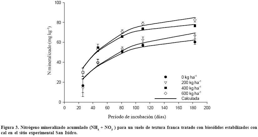 El cálculo de la dosis agronómica de biosólidos requiere del conocimiento de la tasa de mineralización del nitrógeno, el cual es la proporción del material que se descompone en el suelo a través del tiempo y es la clave para calcular las dosis de aplicación de residuos orgánicos (Stanford y Smith, 1972). La mineralización es la transformación del nitrógeno orgánico en amonio (NH4+) y nitrato (NO3-) mediante la acción de los microorganismos del suelo y depende del contenido de materia orgánica, la humedad y la temperatura del suelo, la proporción carbono-nitrógeno (C:N), el tipo de suelo y la disponibilidad del nitrógeno orgánico para los microorganismos, entre otros factores (Eghball et al., 2002; Castellanos et al., 2000; Ross, 1989; Jarvis et al., 1996; Pratt et al., 1973).