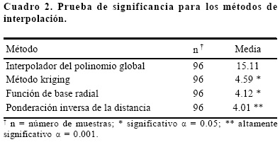 El análisis de los diferentes modelos de interpolación empleados en esta investigación muestra que el IDW es el más significativo (Cuadro 2), mientras que el GPI tuvo una menor significancia. Sin embargo, el considerar que el IDW asume que las predicciones son una combinación lineal de los datos (Schloeder et al., 2001), tiende a producir patrones poco reales, conocidos como tipo "ojo de buey", alrededor de los puntos muestreados (Gotway, 1996) y la precisión de las estimaciones es influenciada por la varianza aleatoria, la estructura de variación y la intensidad de muestreo (Lozano et al., 2004), se puede asumir que se requiere un análisis estadístico a nivel de submétodo, con el fin de verificar la validez de los resultados de la primera interpolación.