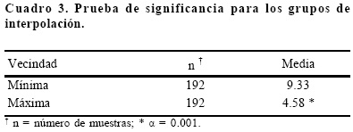 Al realizar la prueba de significancia para los grupos de vecindad (mínima y máxima) se constató que la máxima vecindad resultó más significativa (Cuadro 3), lo que es consistente con el resultado que se encontró al realizar la prueba en los submétodos.