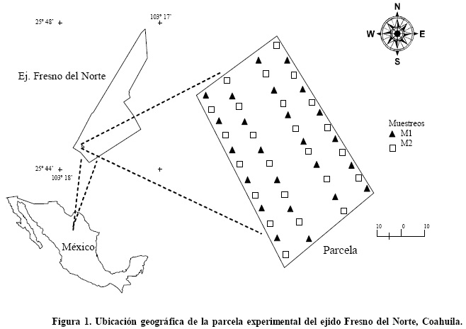 El trabajo se realizó en una parcela del ejido "Fresno del Norte", en el km 30 de la carretera Torreón-San Pedro, Coahuila, ubicado entre los 25° 44' y 25° 48' N y 103° 18' y 103° 17' O (Figura 1). El clima es desértico (BW), de acuerdo con la clasificación de Kóeppen modificado, con un promedio anual de precipitación de 230 mm y una evaporación que es de 6 a 11 veces mayor que la precipitación anual y una temperatura media anual de 20.7 °C (García, 1981).