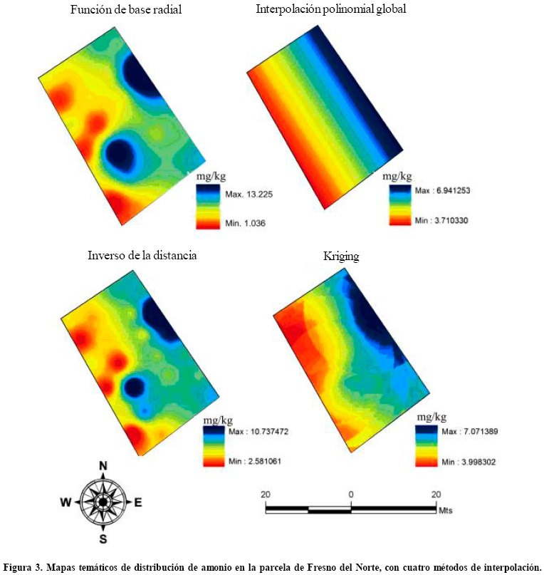 El método geoestadístico de interpolación función de base radial, en su variante línea completamente regularizada, generó mapas de superficies continuas de amonio y nitrato en suelos. Este interpolador, estadísticamente superó a los métodos: interpolador del polinomio global, ponderación inversa de la distancia y krigin. Los métodos de interpolación son una aplicación práctica para establecer la distribución espacial de iones, como el nitrato y el amonio, que pueden contaminar suelos agrícolas por mal manejo. Los mapas que se obtienen a partir de métodos de interpolación pueden utilizarse como herramientas en el manejo de suelos agrícolas, para evitar la contaminación de los recursos naturales.