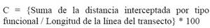 La cobertura de la vegetación se caracterizó para establecer la proporción de parcelas dominadas por árboles, arbustos, buffel e inter-espacios, para lo cual se utilizó el método de intercepción por línea de Canfield (1941). En cada uno de los sitios, se realizaron 20 líneas al azar, de 50 m de longitud cada una. En cada una de las líneas se identificó cada individuo y se midió la distancia que interceptaba sobre la línea, así como la proporción de espacios abiertos. Las especies vegetales encontradas fueron agrupadas según su tipo funcional sensu Díaz y Cabido (1997), como árboles, arbustos, efímeras, diferenciándose al buffel como forma única. La cobertura por cada tipo funcional se obtuvo como porcentaje utilizando la siguiente ecuación: