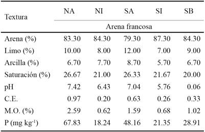 Cuadro 1 Características del suelo (0-10 cm) bajo parcelas de estudio de vegetación natural (NA: árbol, NI: inter-espacio) y sabana de buffel (SA: árbol, SI: inter-espacio y SB: buffel) en la región central de Sonora.