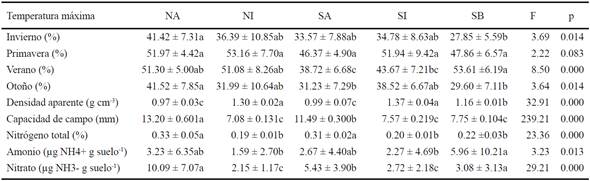 El cambio de cubierta vegetal y su manejo ganadero parecen influenciar aspectos microclimáticos como la temperatura máxima del suelo, la cual fue mayor en NA que en SB en otoño, y que SA en verano, otoño e invierno (Cuadro 2), coincidiendo con las estaciones de mayor crecimiento y acumulación de biomasa del zacate buffel; no obstante, en la etapa de primavera no hubo diferencias estadísticas, que es cuando el pastoreo ya logró remover la biomasa acumulada en las parcelas.