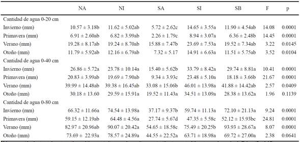 La cantidad de agua en el perfil del suelo, integrada a tres diferentes profundidades (20, 40, 80 cm), presenta valores más altos en los suelos de los inter-espacios (SI y NI; Cuadro 3). En los primeros 40 cm del suelo, el SI tuvo mayor contenido de agua que el SA (P < 0.05). En el perfil de 80 cm de profundidad, los espacios abiertos en el sitio natural (NI) presentaron mayor contenido de agua en primavera y verano (P < 0.05) que el mismo tipo de parcelas en la sabana (SI). El contenido de agua bajo el buffel (SB) y el dosel de árboles en la sabana (SA) fueron aún menores a esa profundidad en la primavera, sugiriendo una mayor extracción de agua a esas profundidades bajo las cubiertas vegetales de la sabana.