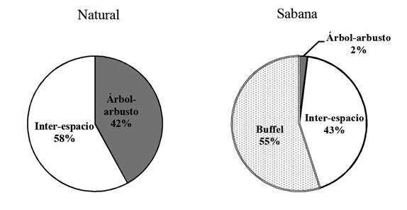 En el sitio natural sin transformar 42% de la cobertura del matorral estuvo ocupada por árboles y arbustos y 58% restante correspondió a los espacios abiertos sin vegetación aparente y sólo ocasionalmente con algunas hierbas (Figura 1). En la sabana predominó la cubierta de buffel con 55%, mientras que 43% fueron espacios abiertos y solo 2% se encontró cubierto por árboles y arbustos. En la sabana, los árboles son remanentes, como resultado de que se dejaron en pié al desmontarse el sitio y solo algunos arbustos se han establecido posteriormente. La disminución en la proporción de ciertos tipos funcionales con el cambio de uso de suelo, como el de las especies arbóreas con capacidad de fijación de nitrógeno, como es el caso de algunas especies de leguminosas, contribuye al cambio en algunas características del suelo (Cuadro 1), y reduce la presencia de islas de fertilidad y de recursos.