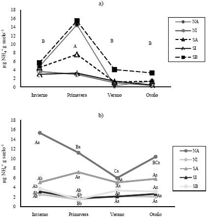 Figura 2 Concentración estacional de amonio (a) y nitrato (b) en parcelas del suelo de vegetación natural (NA: árbol, NI: inter-espacio) y sabana (SA: árbol, SI: inter-espacio y SB: buffel). Letras mayúsculas diferentes horizontalmente (A, B y C) indican diferencia significativa para cada parcela; letras minúsculas (a, b, c) indican diferencia entre parches con la prueba de Fisher (P < 0.05; NH4 + estación * habitat: F: 4.17, p = 0.002; NO3 - estación: F: 181; P < 0.0001).