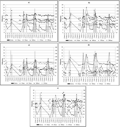 Figura 3 Humedad estacional (mm) en el perfil del suelo de 0 a 200 cm de profundidad para las parcelas de vegetación natural: a) árbol y b) inter-espacio; y en sabana: c) árbol, d) inter-espacio y e) buffel. Las columnas muestran la precipitación acumulada (mm).