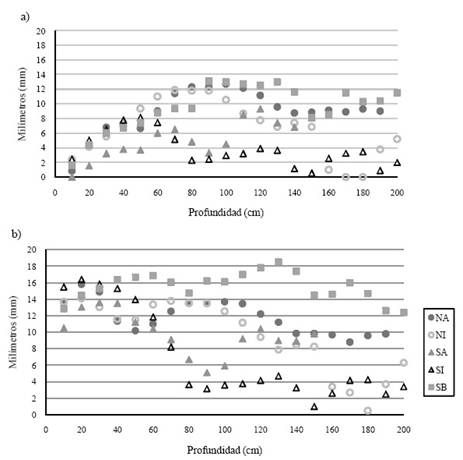 Los datos de los contenidos de agua en el suelo a diferentes profundidades durante los cuatro años de muestreo (2010-2013) se especifican en la Figura 3. En todas las parcelas, la humedad de suelo respondió positivamente a los pulsos de precipitación, principalmente en las capas más superficiales (10 y 50 cm). En la vegetación natural, los mayores contenidos de agua se presentaron a los 100 cm de profundidad, principalmente debajo del dosel de los árboles (Figura 3a y b). En contraste, los mayores contenidos de humedad en la sabana se presentaron a los 50 cm en las parcelas con árboles (SA) y en los espacios abiertos (SI) (Figura 3c y d). Bajo la cubierta de buffel hubo mayores contenidos de humedad a 100 cm de profundidad, similar a lo registrado en el sitio natural (Figura 3e).