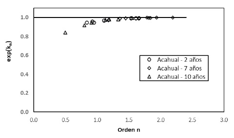 Para analizar la relación orden n-tasa de reacción k n , bajo la consideración de cuando -k n → 0, entonces exp(k n ) → 1, se analizó el espacio n-exp(k n ), Figura 8. Cuando n = 1 (modelo exponencial) se puede establecer como un umbral donde el COS a profundidad está en equilibrio, dado que exp(k n ) es cercano a 1. Para valores de n > 1, exp(k n ) tiende a estar más cerca de 1. Los valores de exp(k n ) cercanos a uno implican una “profundidad media de residencia” muy grande, por lo que el modelo depende solo de su grado de estabilidad o equilibrio (orden n).