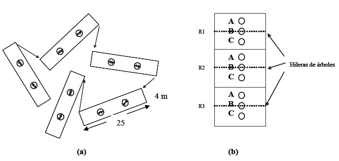 En el caso del Sistema Agrícola Mixto (SAM) y Sistema Agrícola Anual (SAA) se utilizó una parcela de 9 m de longitud y anchura variable, dependiente del tratamiento utilizado. En cada parcela se utilizaron tres repeticiones (R1, R2 y R3), Figura 2b, y se establecieron tres puntos (relojes) de medición en cada repetición (puntos A, B y C, Figura 2b), perpendicular a la hilera de las plantas del sistema. El punto B se colocó cercano a las plantas, por lo que la influencia de éstas es mayor que en los puntos A y C.
