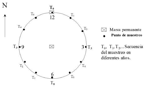 Para el Sistema de Vegetación Forestal y Sistema Agrícola Permanente, se utilizaron 5 parcelas de muestreo distribuidas al azar en los sistemas, de 25 m de longitud y de 4 m de ancho, Figura 2a. En cada parcela se establecieron dos puntos de muestreo (relojes) y en cada reloj se realizaron dos mediciones, por lo que el total de mediciones (perfiles) fue de 20 (=5×2×2). Los puntos de medición fueron realizados en círculos fijos (varillas enterradas), midiéndose el año 2000 (T0, primer año) en el punto de las 12 y 6 horas, Figura 3. Los otros puntos del reloj se midieron en años posteriores, pero solo en la capa superficial del suelo.