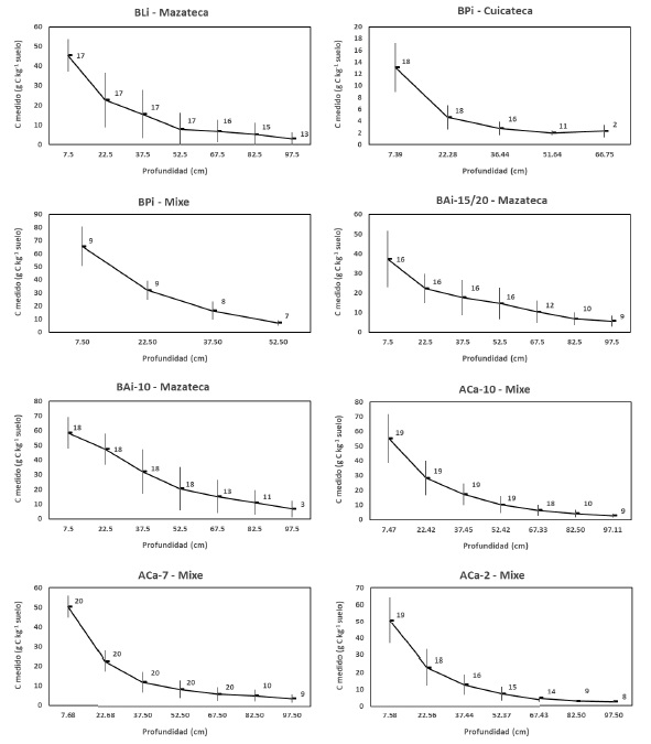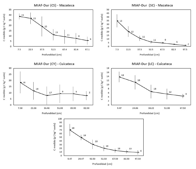 En lo general, todos los análisis del COS a profundidad se realizaron usando la profundidad media de las mediciones (7.5, 22.5, 37.5, 52.5, 67.5, 82.5, 97.5 cm), con algunos casos de valores de profundidad diferentes por el uso de muestreos diferentes de los nominales.