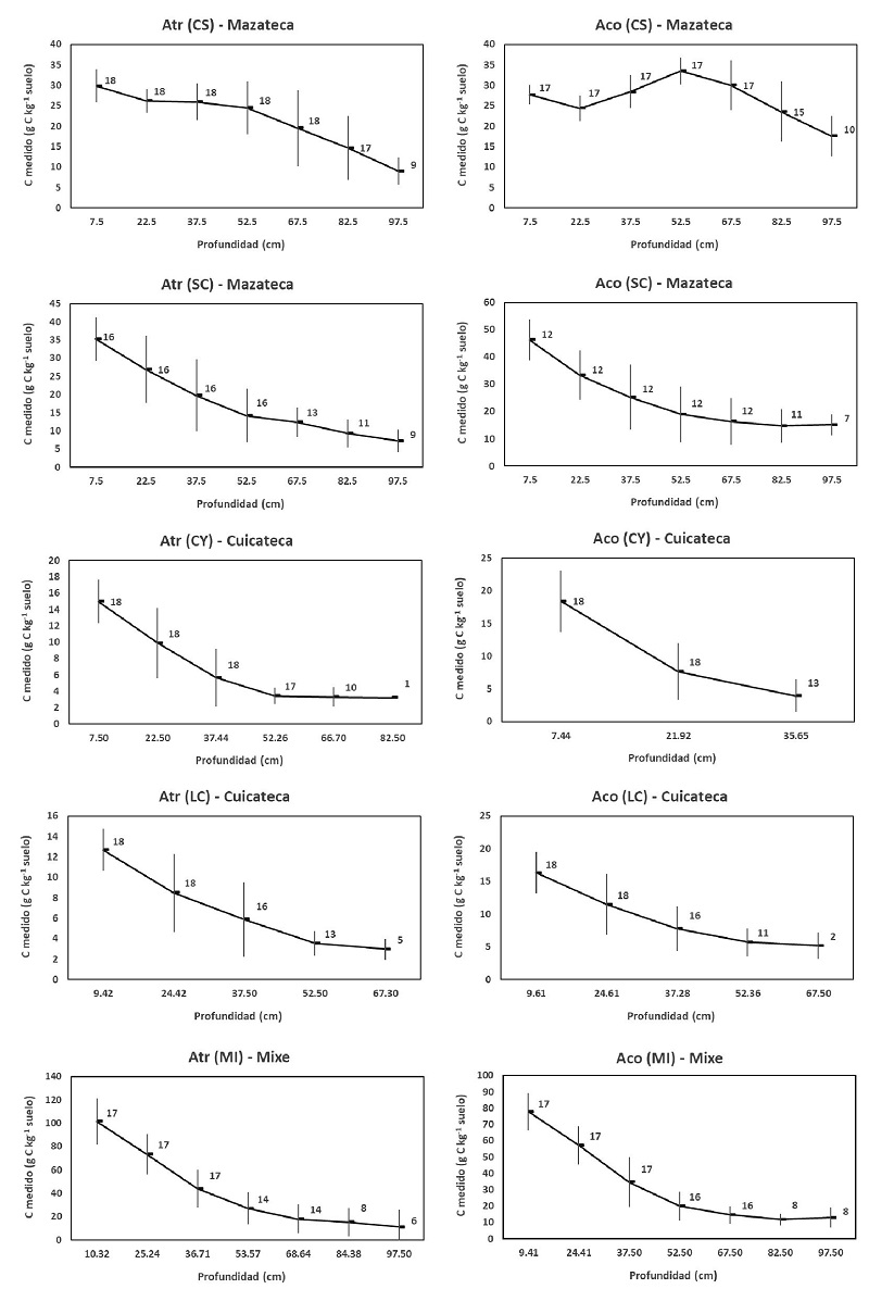 Finalmente, en la Figura 7 se observan los patrones de la distribución vertical del COS de los Sistemas Agrícolas Anuales, donde el patrón de ACO (CS) en la región Mazateca tiene horizontes enriquecidos de C en las profundidades medias, por lo que este sistema no fue analizado en lo siguiente por representar discontinuidades. Los patrones del COS son decrecientes (convexos), con excepción de ATtr (CS) de la región Mazateca que es cóncavo.