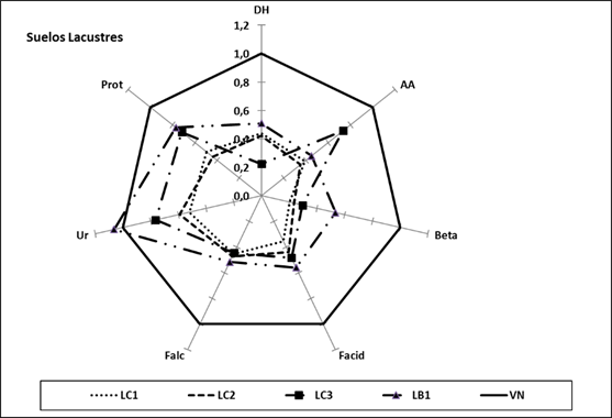 En las Figuras 3 y 4 se muestran los gráficos de radar para cada tipo de suelo (lacustre y aluvial) bajo los dos tipos de uso de la tierra (caña de azúcar y banano) donde vemos que ambos usos disminuyen la calidad del suelo al compararse con el suelo bajo vegetación nativa (no deteriorado) y confirma lo encontrado por los otros índices. Llama la atención que aquellos suelos lacustres cultivados que reciben aportes orgánicos externos presentaron los mayores índices (Cuadro 3), como es el caso del suelo lacustre bajo caña de azúcar (LC3) regado con aguas residuales o el suelo bajo cultivo de banano (LB1), el cual además de ser regado con aguas servidas tratadas, adicionalmente recibe gallinaza como enmienda orgánica y para este último suelo la actividad de la enzima ureasa resultó ligeramente mayor que en el suelo bajo vegetación nativa y por consiguiente dicho vértice sobresale en el gráfico de radar. En el caso de los suelos aluviales cultivados, todos ellos reciben aguas de los ríos Aragua y Turmero altamente contaminados y eventualmente, de acuerdo a la disponibilidad, aguas del embalse Zuata; los suelos sembrados con bananos (AB1 y AB2), los cuales anteriormente estaban cultivados con maíz, probablemente ya degradados, presentan menores índices a diferencia de los cultivados con caña de azúcar.