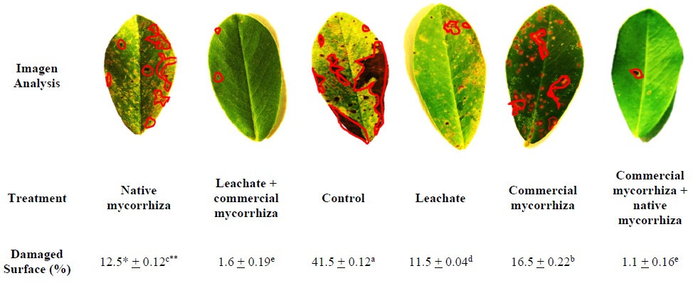 Figure 5: Image analysis of the damaged area in the leaves of the foliar biomass of the peanut crop under the influence of vermicompost leachate and mycorrhizae. * Mean of three repetitions. ** The averages (± standard error) within each column without common superscript differ significantly at P <0.05.