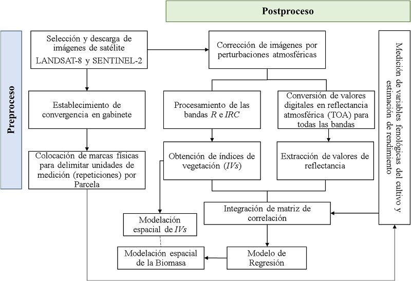 La obtención y procesamiento de insumos requeridos para llevar a cabo la presente investigación comprendió de cinco componentes clave: 1) Localización, descarga y procesamiento de imágenes de satélite; 2) Asociación de los valores de reflectancia y los datos de campo conforme a la resolución espacial de las imágenes de satélite empleadas; 3) Estimación de IV con base en ocho ecuaciones; 4) Gestión de información de campo conforme al tamaño de muestra de la unidad de estudio; y 5) Análisis estadístico (Figura 2).