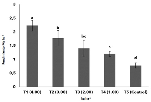 El rendimiento del cultivo de cacao se vio directamente afectado por la aplicación de diferentes dosis de silicio (Si). Los tratamientos experimentales exhibieron rendimientos que oscilaron entre 1 y 2.23 Mg ha-¹. Se destacó un rendimiento máximo (P ≤ 0.05) en los frutos de cacao cuando se aplicaron 4.00 kg ha-¹ de Si, alcanzando un valor de 2.23 Mg ha-¹, evidenciando diferencias significativas (P ≤ 0.05) con respecto a los demás tratamientos. Aunque los tratamientos 3.00 y 2.00 kg ha-¹no presentaron diferencias significativas entre sí (P ≥ 0.05), sí exhibieron diferencias respecto al tratamiento control. Estos resultados refuerzan la influencia positiva de la aplicación de silicio en el aumento de los rendimientos de frutos, con implicaciones importantes para la optimización de la producción de cacao (Figura 1).