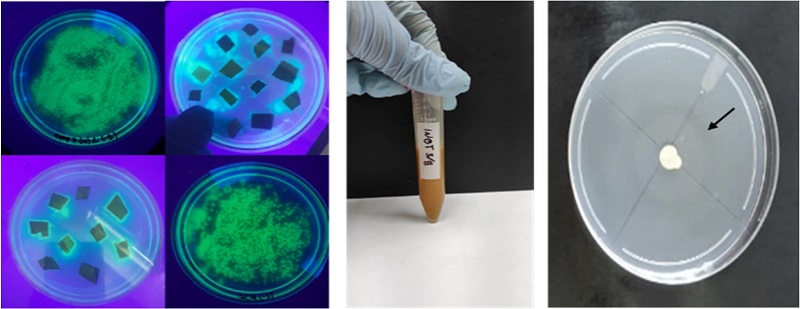 Figura 1: Selección de bacterias fluorescentes de cultivares endémicos CCN-51 y caracterización bioquímica. A. Colonias extraídas del sistema radicular y foliar. B. Producción de sideróforos. C. Actividad Proteolítica. La flecha marca el halo de degradación alrededor de la colonia en el medio de cultivo Gelatin Agar.
