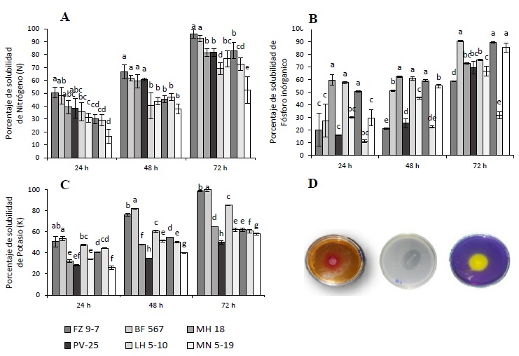 Figura 2: Respuesta de solubilización de N, P y K por las rizobacterias. A, B y C) Porcentaje de solubilización de N-P-K a 24, 48 y 72 h después de la inoculación. D) Colonias bacterianas que muestran zonas de halo claras alrededor del crecimiento microbiano de nuevos aislados bacterianos que disuelven minerales. Las barras indican el DE individual para tratamiento (±). Medias con letras iguales en la columna no difieren significativamente según Tukey (P ≤ 0.05).