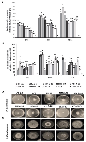 Figura 3: Efecto de los sobrenadantes bacterianos en inhibición del desarrollo micelial. A y B El Porcentaje de Inhibición al desarrollo micelial de los hongos a 24, 48 y 72 h después de la inoculación. C y D). Visualización de los sobrenadantes en la inhibición de desarrollo micelial a P. palmivora y L. theobromae. Las barras indican el DE individual para tratamiento (±). Medias con letras iguales en la columna no difieren significativamente según Tukey (P ≤ 0.05).