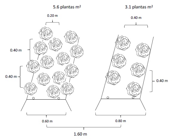 Se levantaron camas de 60 cm de ancho y 18.0 m de longitud y con separación de 1.60 m. Cada parcela experimental consistió en dos camas. Se colocaron dos cintillas por encima de cada cama. La cintilla contaba con emisores separados cada 20 cm. El gasto por emisor fue de 0.5 L h-1. Se utilizaron plántulas de 45 días de edad de la variedad Charmant (Grupo Sakata, México S.A. de C.V.). El trasplante se realizó en forma manual el 29 de septiembre de 2016.