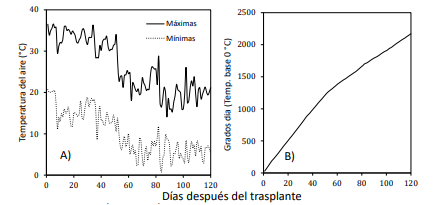 La Figura 2 muestra el comportamiento de la temperatura y los grados día acumulados durante el desarrollo del experimento. Las temperaturas máximas que transcurrieron fueron alrededor de los ≈35 °C, y conforme transcurrió el experimento se redujeron hasta alcanzar los ≈20 °C. Las temperaturas mínimas fluctuaron entre los ≈20 °C y los ≈5 °C. Por otro lado, la cantidad de grados día ocurridos durante el experimento fueron de un total de 2170. En general, el ambiente que prevaleció fue el que ha sido recomendado como óptimo para el desarrollo y crecimiento de este tipo de cultivos (Criddle, Smith y Hansen, 2017).