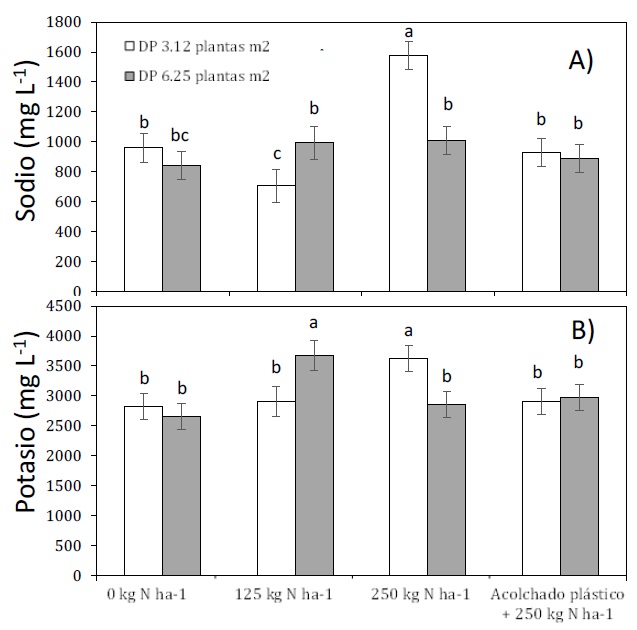 De los minerales evaluados en el extracto celular de la nervadura central de hojas de repollo, el sodio (Na) y el potasio (K) fueron los que presentaron efecto interactivo entre el MN × DP (P < 0.028), (Cuadro 3). La concentración de Na fue mayor en las plantas fertilizadas con 250 kg N ha-1 y con densidad de población de 3.12 plantas m2, mientras que concentraciones menores fueron para las plantas que recibieron 125 kg N ha-1 y una densidad de población de 3.12 plantas m2. El resto de las plantas mantuvieron una concentración de Na relativamente igual (Figura 3A, B). Por otro lado, las mayores concentraciones de K estuvieron en las plantas que recibieron 125 y 250 kg N ha-1 en ambas densidades de población. El resto de las plantas mantuvieron valores iguales de K en el extracto celular.