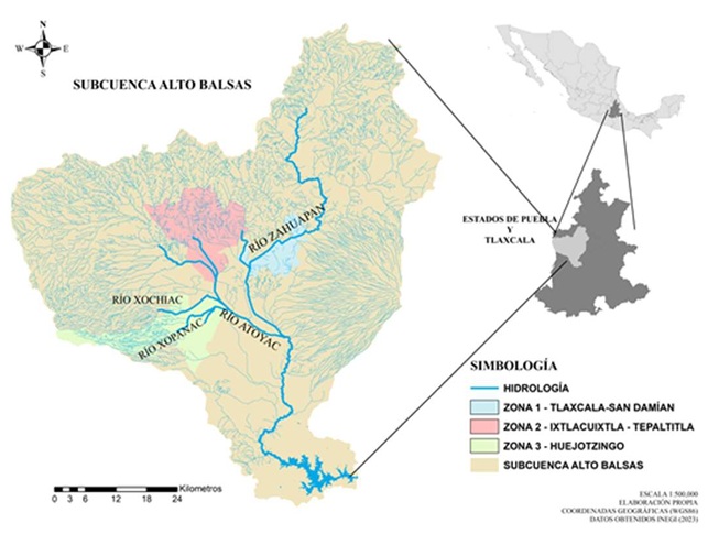 El estudio se llevó a cabo en la subcuenca del Alto Balsas, que se localiza parcialmente en el área metropolitana de los estados de Puebla y Tlaxcala, extendiéndose entre los paralelos 19° 42’ 10.82” y 18° 51’ 42.27” N, y 97° 57’ 34.07” y 98° 17’ 43.23 2 O (INEGI, 2019). El área de estudio se dividió en tres zonas tomando como criterio los sitios de alto, mediano y bajo impacto por contaminantes antropogénicos como: desechos domésticos, agrícolas e industriales, considerados como fuente importante de contaminación por metales pesados en sus efluentes. Estas áreas se seleccionaron después de realizar un estudio preliminar presentando características homogéneas en cuanto a sus fuentes hídricas, tipos de cultivos y actividad industrial.