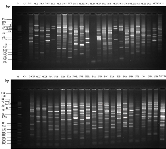 La riqueza y diversidad de aislados bacterianos se determinó con la técnica ERIC-PCR, que, tras obtener el ADN genómico de cepas puras, generó patrones genómicos de diferentes tamaños (Figura 1). Los perfiles genómicos ERIC agruparon a 46 cepas bacterianas aisladas de la rizosfera y tejidos vegetales de las plantas de maíz dentro de 26 grupos diferentes. Los índices de riqueza (d) y diversidad (H) fueron más altos en la rizosfera (d: 5.40, H: 6.60) que en los tejidos vegetales (d: 2.08, H: 3.70). Con respecto a la diferencia entre la cantidad de aislados según la sección de la planta, se ha evidenciado que las zonas más cercanas a las raíces (la rizosfera) o en el interior de estas, habitan una mayor diversidad de bacterias y que pueden colonizar la endosfera (Maldonado-Mendoza y Morales Ruíz, 2021).