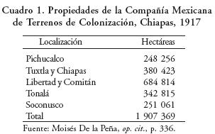 Las haciendas de Chiapas perduraron en la dictadura porfirista, se prolongaron hasta la posrevolución y algunas daban fe de su existencia en el ya avanzado siglo XX. Los sistemas de trabajo, descritos entre otros por Bruno Traven y Armando Bartra, expresan las condiciones inhumanas de explotación de la fuerza de trabajo impuesta por los señores de la tierra y por el gobierno de Díaz, un régimen muy controvertido, del que existen diferentes opiniones dependiendo del rol asumido en las explotaciones, según sean extranjeros que hacen negocios o mexicanos que sufren la opresión de los grupos de poder. Por este mecanismo salieron del dominio nacional y pasaron a manos de la Compañía de Tierras y Colonización de Chiapas, México, Limitada, 1 907 369 hectáreas,12 que ésta vendió de manera predominante a extranjeros.