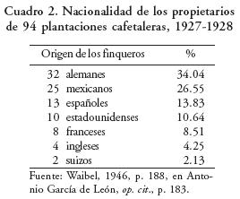 Avanzada la segunda década del siglo XX, las superficies en propiedad de la Compañía Mexicana de Terrenos de Colonización, eran varias y también parecían serlo las superficies dedicadas a la producción de café en manos de extranjeros; hacia 19271928, 73.4 por ciento de los finqueros dedicados a la producción de café eran extranjeros, de ellos, 34 por ciento eran alemanes.