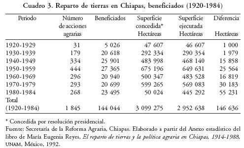21 María Eugenia Reyes, El reparto de tierras y la política agraria en Chiapas 19141988, UNAM, México, 1992, p. 136, Anexos estadísticos.