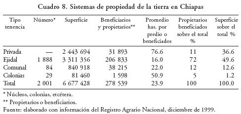 La información del Censo Agrícola Ganadero Ejidal de 1994 presenta algunas variaciones, con una superficie ejidal más reducida. Indudablemente es de una fecha anterior a los Acuerdos Agrarios y la diferencia puede coincidir con la acción agraria puesta en marcha a partir del surgimiento del EZLN en el escenario nacional, y la dotación de tierra otorgada a algunas organizaciones demandantes mediante la compra, por parte del gobierno, a los propietarios privados. Paralelamente el gobierno dio por concluida la reforma agraria en el estado. En el cuadro 8 se observa la ventaja de extensión promedio de tierra en favor de los propietarios privados, que poseen también las tierras de mejor calidad.