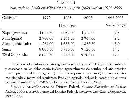 En cuanto a la primera cuestión, se podría hablar sólo de un problema de falta de integración de lo rural en lo urbano, de una interface, que tendría que desaparecer con el avance inminente de la urbanización. Sin embargo, la superficie dedicada a cultivos agrícolas en vez de desaparecer se ha incrementado; independientemente de que ello haya sido una extensión de la frontera agrícola en la zona de bosques y vegetación.61 Es decir, el suelo de uso agrícola en vez de disminuir en Milpa Alta, como ha sido la tendencia en las últimas seis décadas en el Distrito Federal, creció 22.8% al pasar de 9 528 a 11 699 hectáreas, de 1994 al periodo 20022005.62