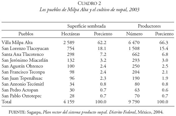 Con respecto a su localización espacial, y como se puede observar en el Cuadro 2, en 2003 sigue siendo la cabecera delegacional donde se siembra más nopal con el 62.2%. Y junto con los pueblos conurbados de San Agustín Ohtenco, San Jerónimo Miacatlán, San Juan Tepenáhuac y San Francisco Tecoxpa, suman el 72.5% de la superficie sembrada total. Los otros pueblos significativos también siguen siendo San Lorenzo Tlacoyucan y Santa Ana Tlacotenco.63 En cuanto al número de productores, su monto es obviamente mayor en los pueblos con más superficie sembrada, siendo sobresaliente que Villa Milpa Alta, San Lorenzo Tlacoyucan y San Agustín Ohtenco tienen, en conjunto, casi 85% del total.