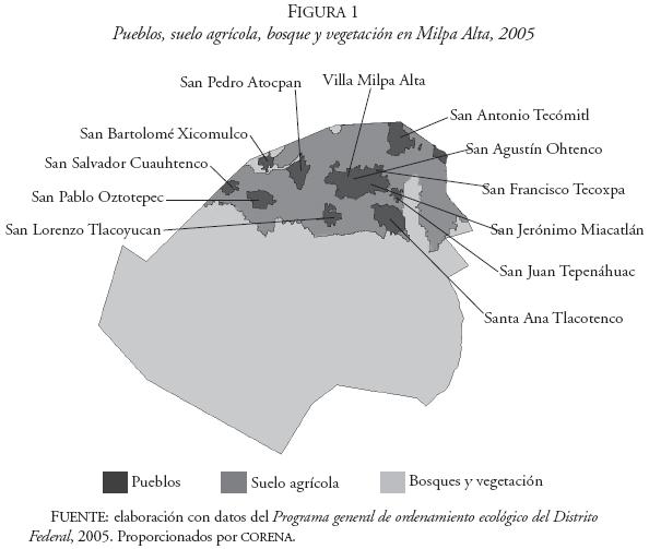 En Milpa Alta existe una división territorial en 12 pueblos tradicionales (véase Figura 1) con 29 barrios, que celebran cada año 720 fiestas, entre religiosas y paganas.28 Esta naturaleza "tradicional" de los pueblos, le da especial trascendencia a la clasificación como urbanos o rurales, y hace necesario tener muy en cuenta su relación con el entorno ambiental.29 En consecuencia, es importante considerar criterios como los del Programa General de Ordenamiento Ecológico del Distrito Federal (PGOEDF), que establece que los 12 pueblos tradicionales de Milpa Alta se clasifican como rurales, y tienen mucha importancia en la reproducción del entorno natural de la Ciudad de México, por los servicios ambientales que suministran a ésta, como el agua y la regulación del clima.30