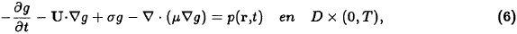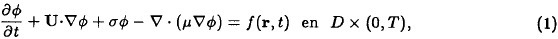 donde U = U(r,t) denota la velocidad del viento en D y se asume que cumple la ecuación de continuidad (5). σ > 0 y μ > 0 son los coeficientes de destrucción química de la especie contaminante y difusión turbulenta respectivamente, y ƒ(r,t) es el forzamiento formado por las fuentes puntuales de emisión del contaminante: